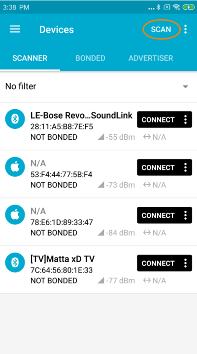 Start by scanning for nearby Bluetooth devices with the nRF app by tapping on the “scan” button. Also activate the c-temp with a double tap and make sure that no other Bluetooth device is currently connected to the c-temp.