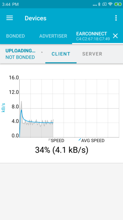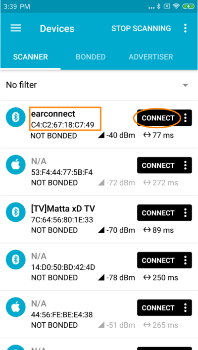 In the scan list you should find the the c-temp (or One) as “earconnect”. On an Android phone it is also possible to determine the sensor by its MAC address. Then press the “connect” button.