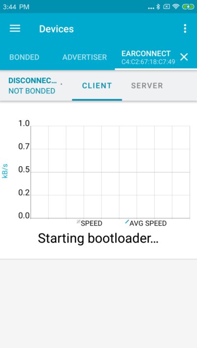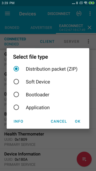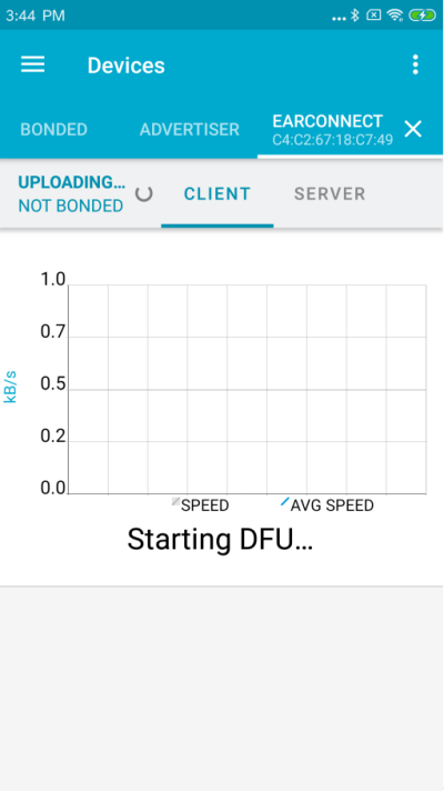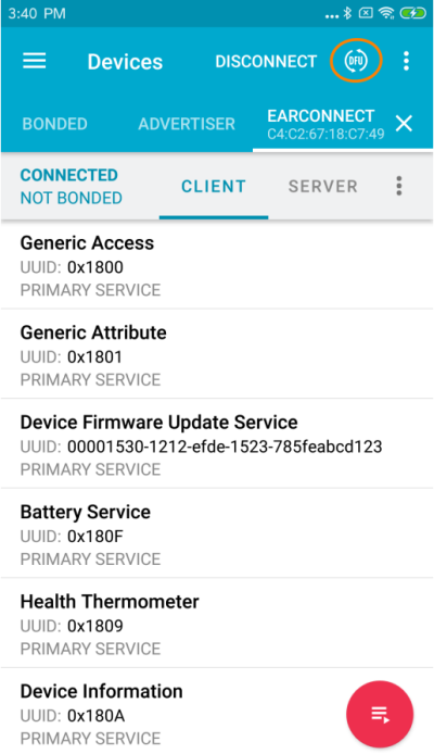 When the device is connected, press the DFU symbol. (Compared to the Two, it is not necessary to bond the device before doing the DFU.)