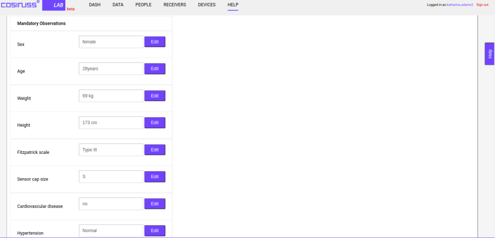 Once you have found the perfect sensor size you can go on with the subject's information. Please fill in all mandatory observations listed on the interface. Additionally, you can collect data about other medical histories of the subject.