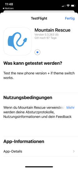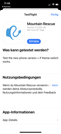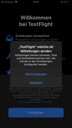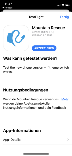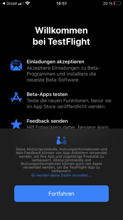 Öffnen Sie nun die TestFlight App und akzeptieren Sie alle Bedingungen (nur beim ersten Öffnen der App notwendig).