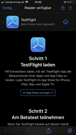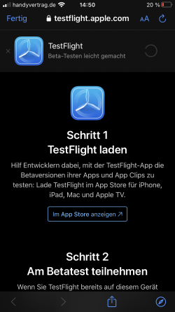 Falls Sie die “TestFlight” app nicht installiert haben, werden Sie auf Apples Hinweisseite weitergeleitet. Installieren sie hierüber, oder über den AppStore die “TestFlight” app.