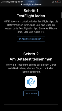 Nachdem Sie die TestFlight Bedingungen akzeptiert haben, gehen Sie zurück auf Apples Hinweisseite und klicken unter Schritt 2 auf “Jetzt testen” (oder klicken Sie erneut auf den Link in der Email).