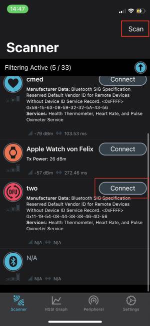 Then scan in the app and connect to the sensor. If the sensor is in automatic mode, the scanning and connecting will only work if the sensor is rapidly flashing blue (10 s each 60 s).