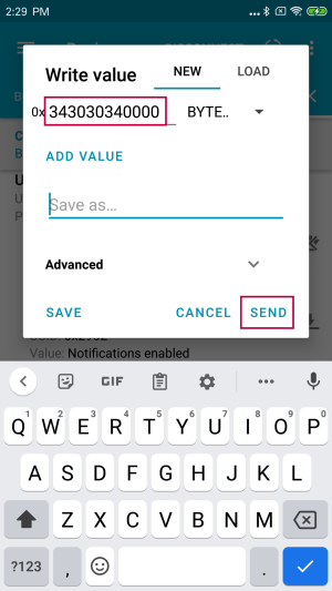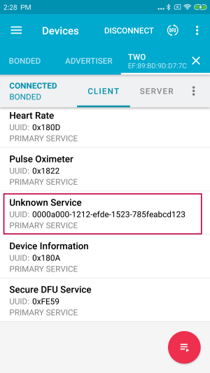 Once connected, search for the unknown service which contains two unknown characteristics. On Android, tap on the service in order to reveal the unknown characteristics.